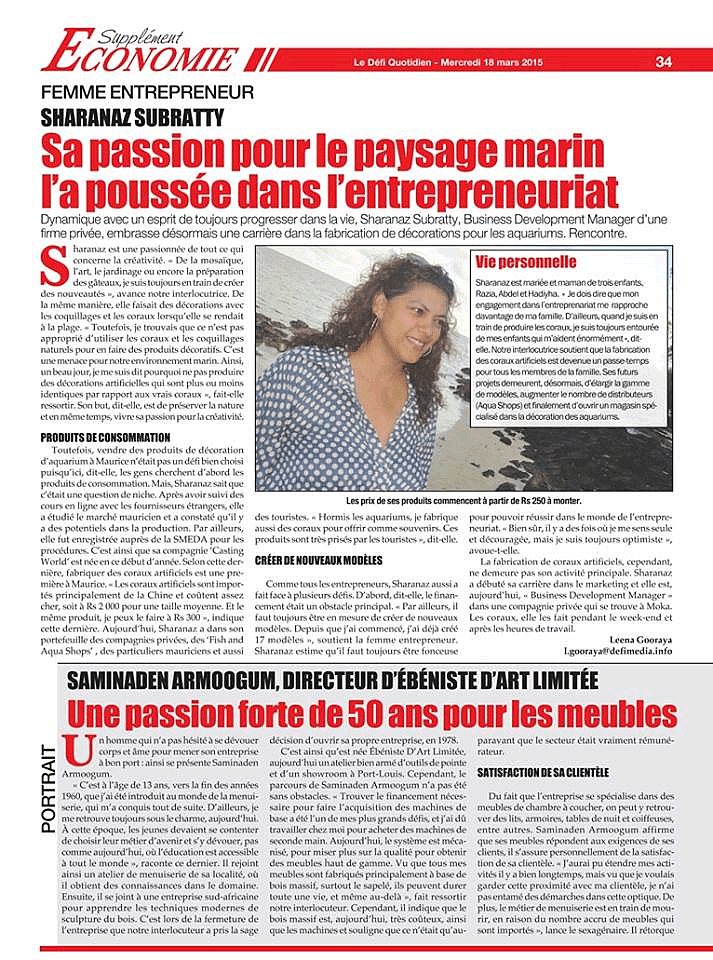 Dynamique avec un esprit de toujours progresser dans la vie, Sharanaz Subratty, Business Development Manager d'une firme privée, embrasse désormais une carrière dans la fabrication de dècorations pour les aquariums. Rencontre.